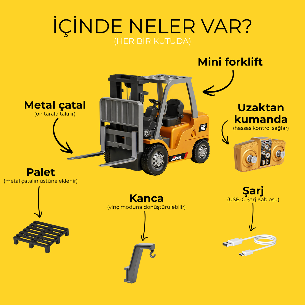 Evet! Her Mini RC Forklift, 2.4GHz uzaktan kumanda ile birlikte gelir. Kutu açıldığı anda oynamaya hazırsınız.
